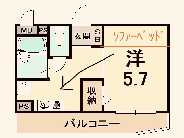 もう一度おさらいだが、キッチンの奥側がお風呂場で、ソファーベッドからお風呂の半透明のドアが見える構造の間取りで、